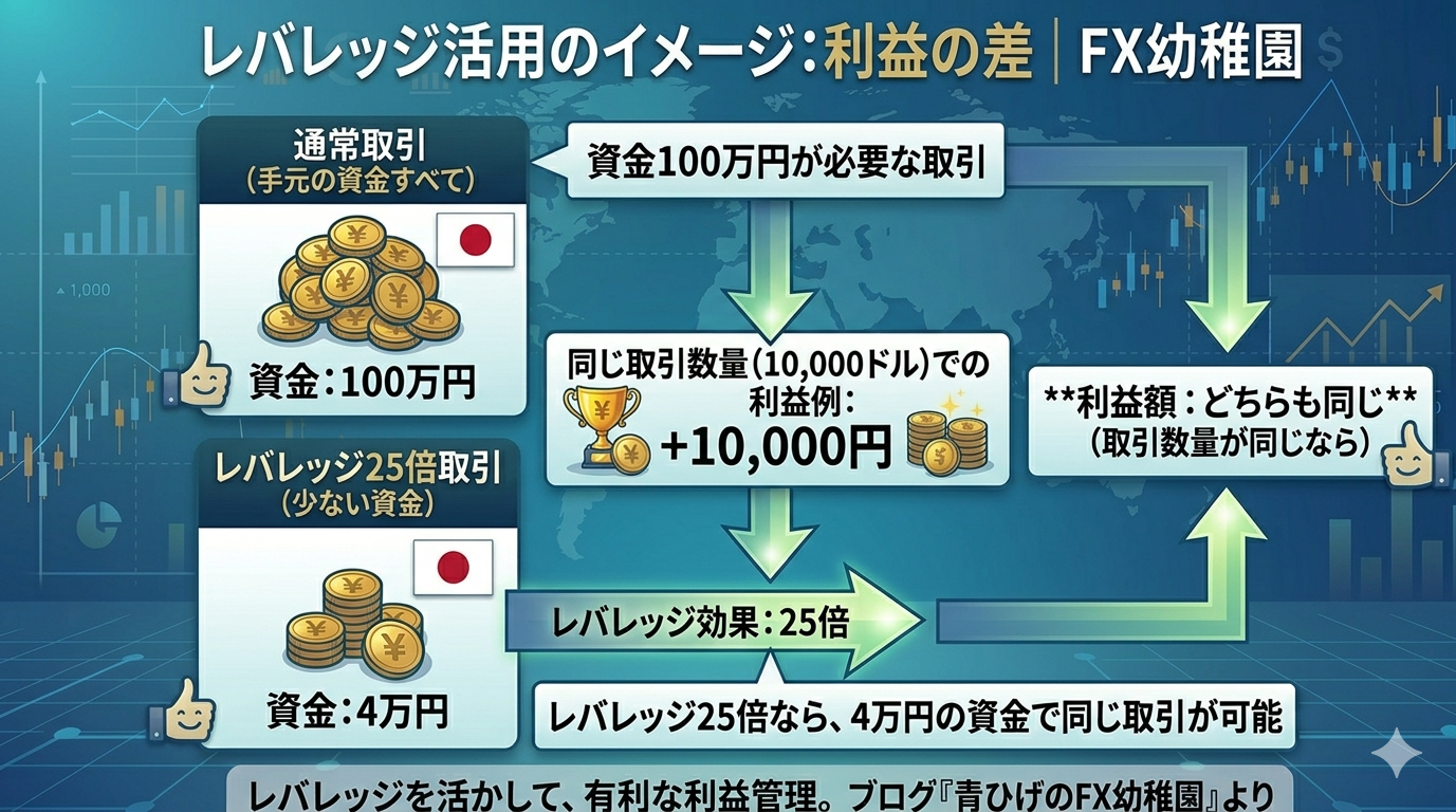 ※どちらも「1円」動いた時の利益額は同じです。4万円の資金で100万円分と同じ利益を狙えるのがFXの強みです。