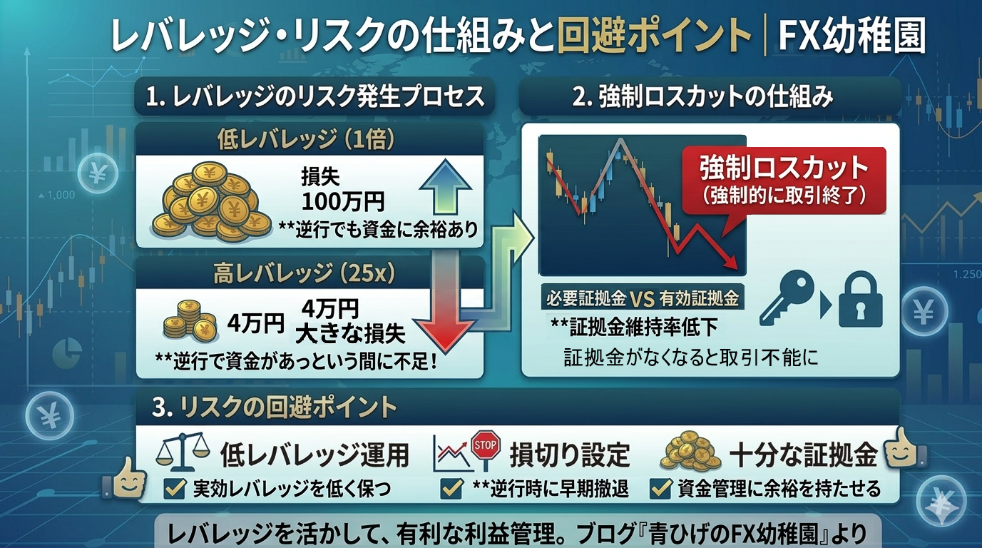 レバレッジは非常に便利ですが、「損失も同じ倍率で膨らむ」ということを忘れてはいけません。